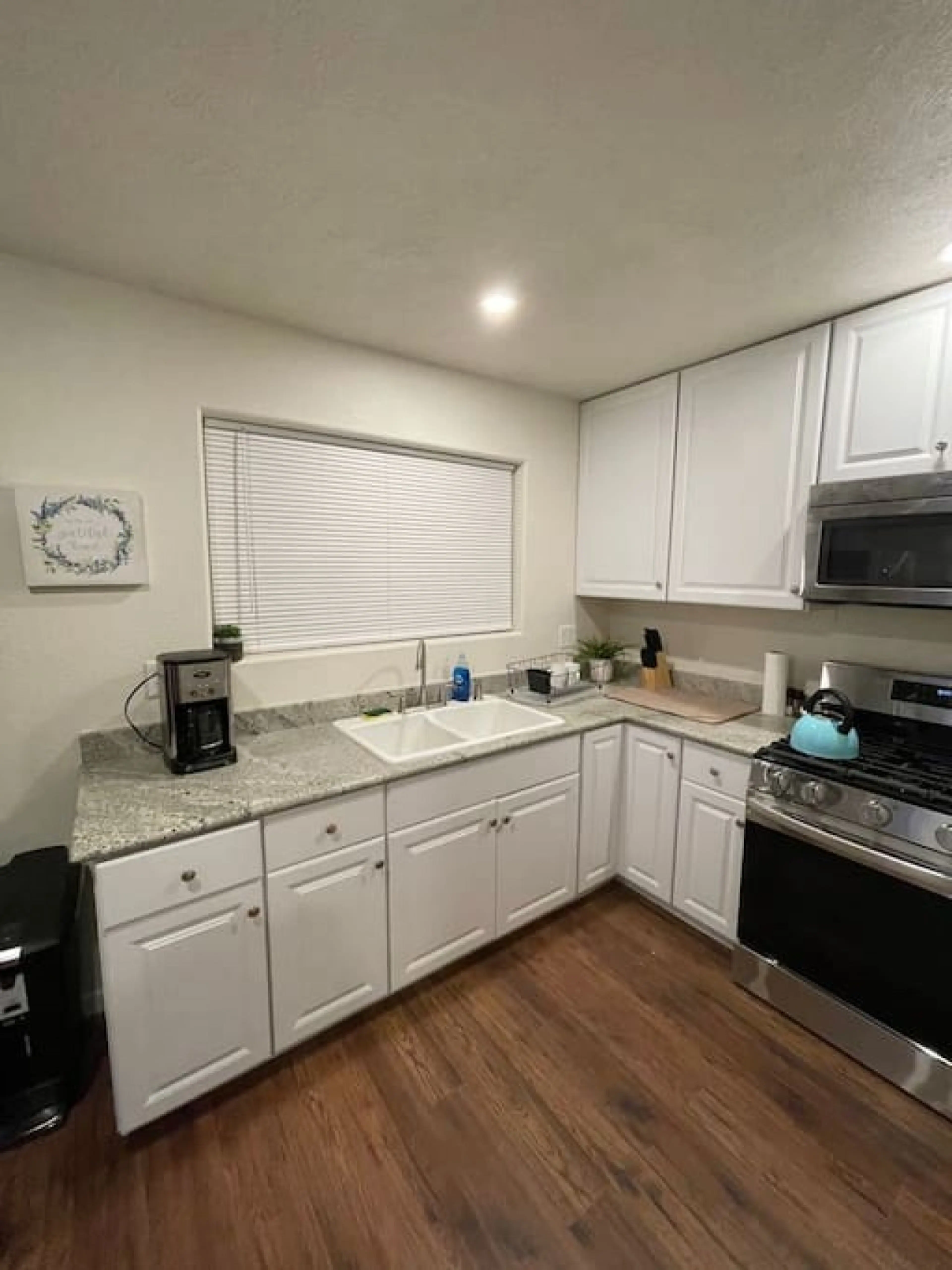 - The refrigerator was warm when we arrived. - No smoke detector in the living room. A mount for it was present on the ceiling, but the detector itself was missing. This is absurd, especially considering their policy on tampering with the smoke detector. - The lamp in the secondary bedroom had exposed wires that shocked me when I tried to unplug it in order to plug in my laptop.- The desk chair in the secondary bedroom is too tall for the desk in that room.- There was a hole in the wall of the master bedroom.- The bed frame was damaged.- Both backyard doors leading outside were unlocked when we arrived.- The power breaker for the bathroom was off when we arrived.- The knives in the kitchen were so dull that they were dangerous. Property management said they would send new ones but never did. - The stove door would not detect that it was closed. Someone put duct tape over the button that detects this to try and "remedy" the issue, and the tape had completely melted. The seal on the door was also poor and made the outer handle hot to the touch when running. - Multiple dirty dishes in the cabinets. Almost everything in the cabinet needed to be washed - The walls and baseboards were dirty - The dresser in the master bedroom is too big for the room. I had to move it away from the closet to be able to open the closet and back to its original spot so the edge didn't hang over the bed - Very slow WiFi that was being shared with 2 other rentals on the property